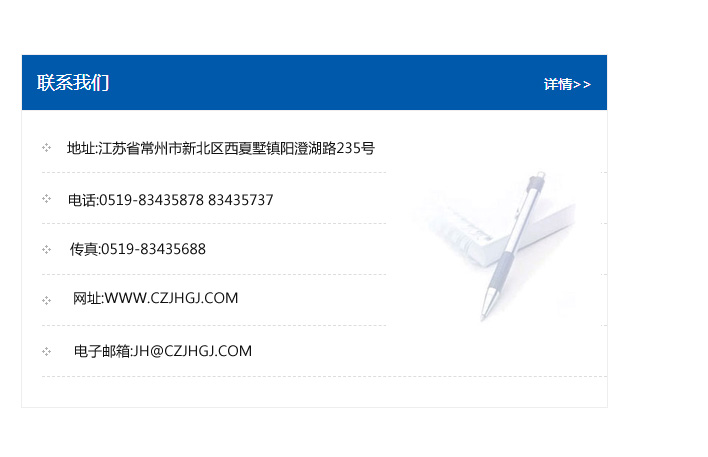 傳真:0519-83435688    郵編:213135    網(wǎng)址:WWW.czjhgj_com.qingdaoluao.com    電子郵箱:JH@czjhgj_com.qingdaoluao.com